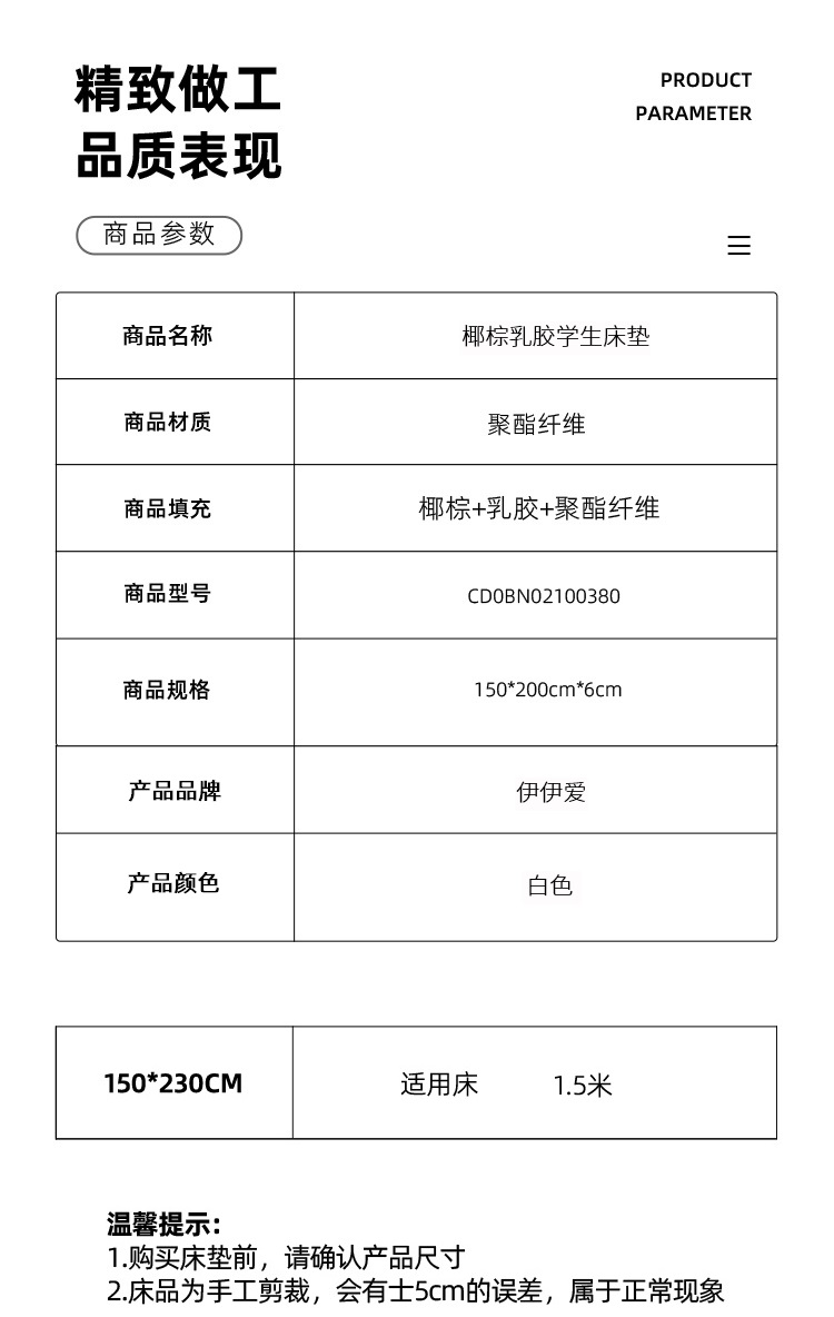 商品名称:伊伊爱CD0BN02100380椰棕乳胶学生床垫150*200cm*6cm白(单位:个)