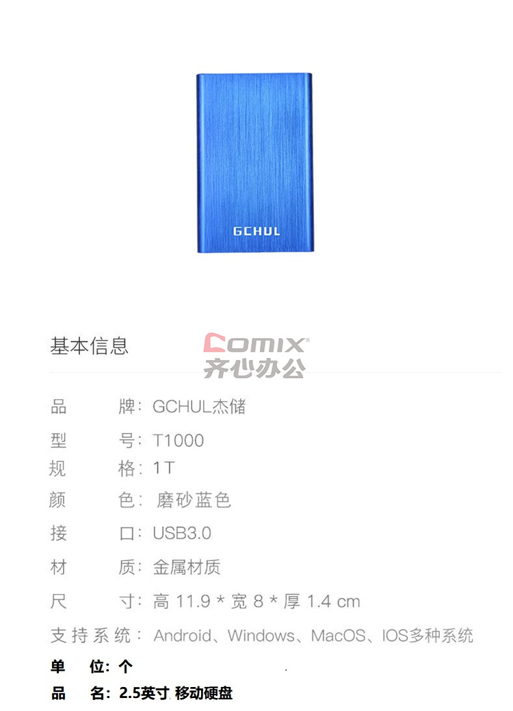 - 商品名称:杰储 T1000 1T USB3.0 2.5英寸磨砂蓝色 移动硬盘 (计价单位:个) 磨砂蓝色