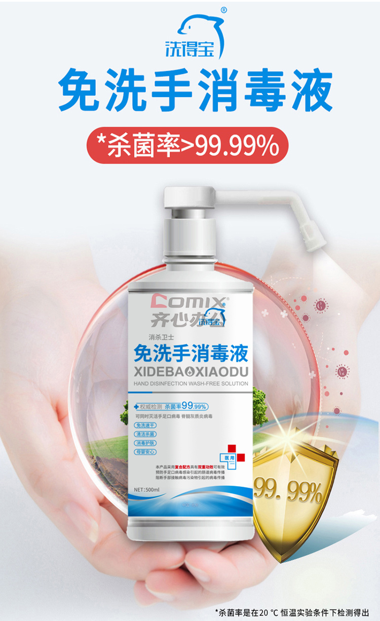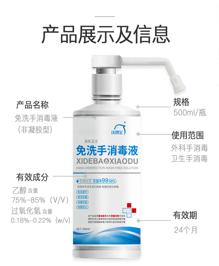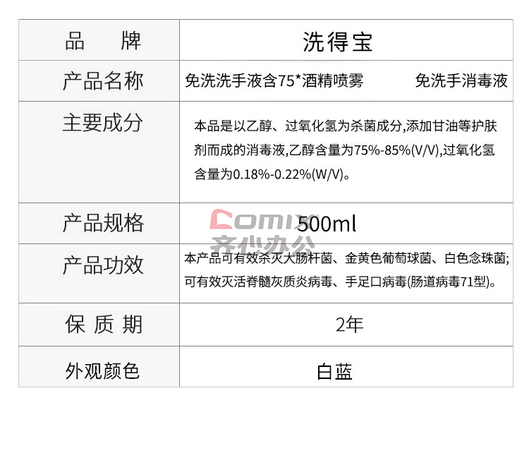 商品名称:洗得宝 免洗洗手液含75*酒精喷雾 500ml 免洗手消毒液 (计价单位:瓶) 白蓝
