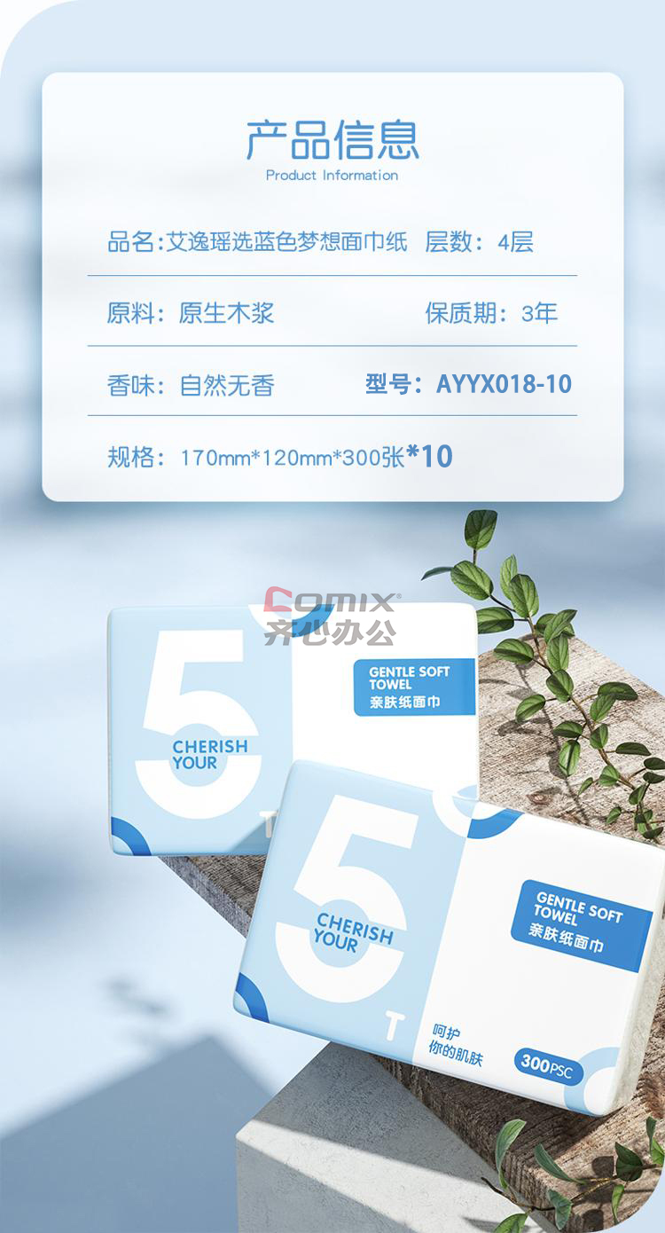 商品名称:艾逸瑶选原生木浆蓝色梦想300张10包软纸抽AYYX018-10 (单位:提)