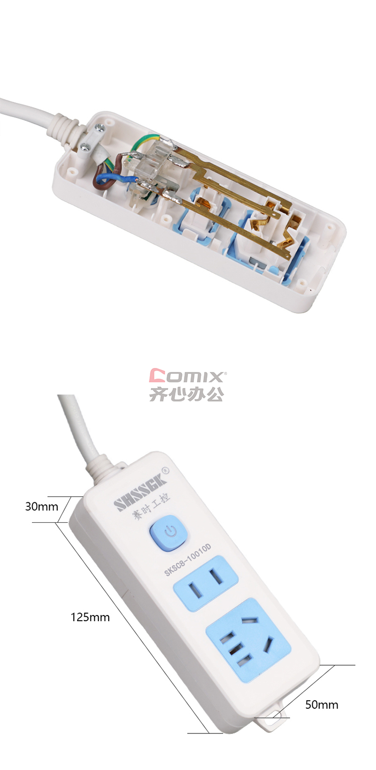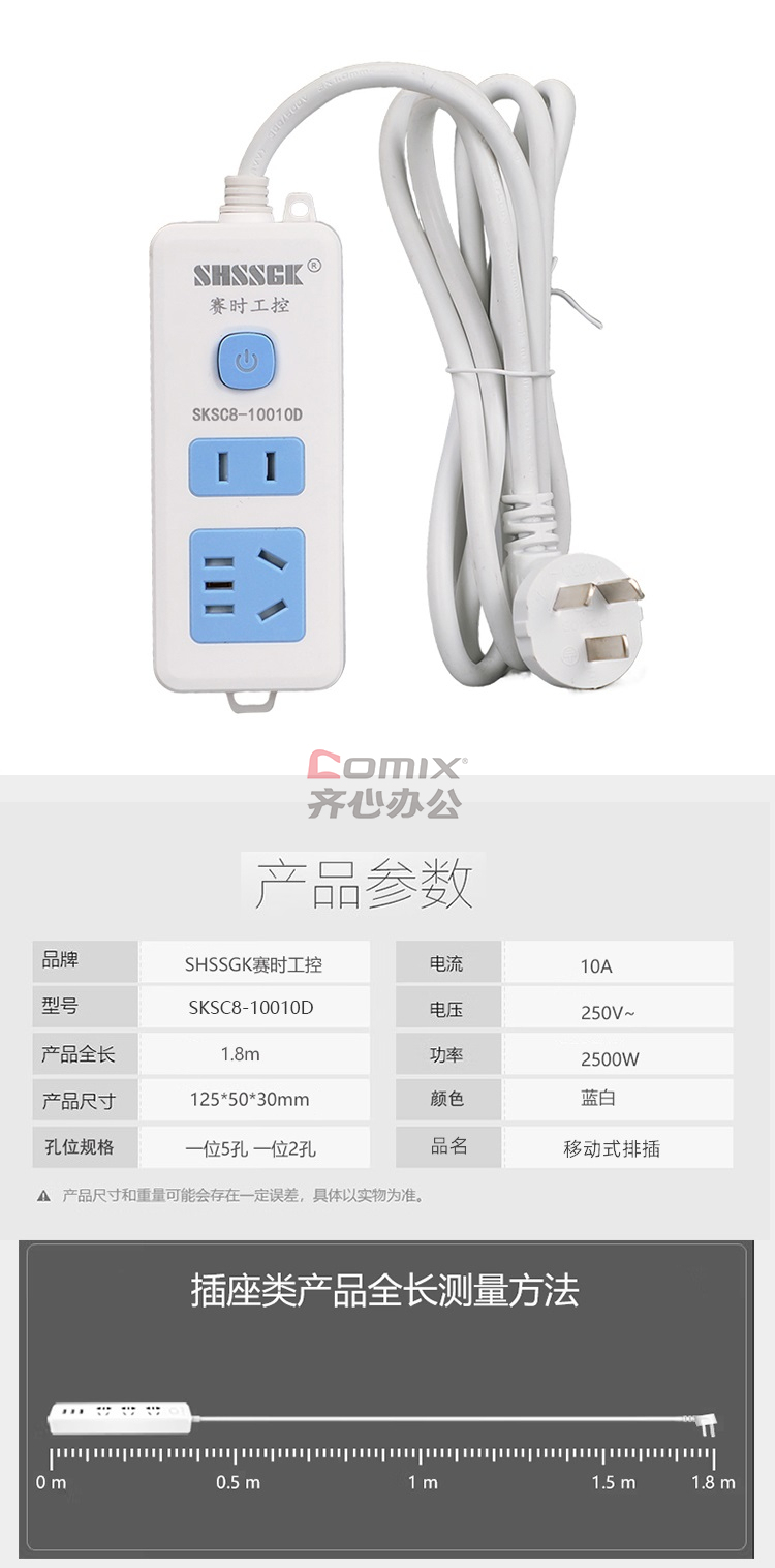 - 商品名称:赛时工控(SHSSGK) SKSC8-10010D 一位5孔 一位2孔 10A 250V 2500W 125*50*30mm 移动式排插 (计价单位:个) 蓝白