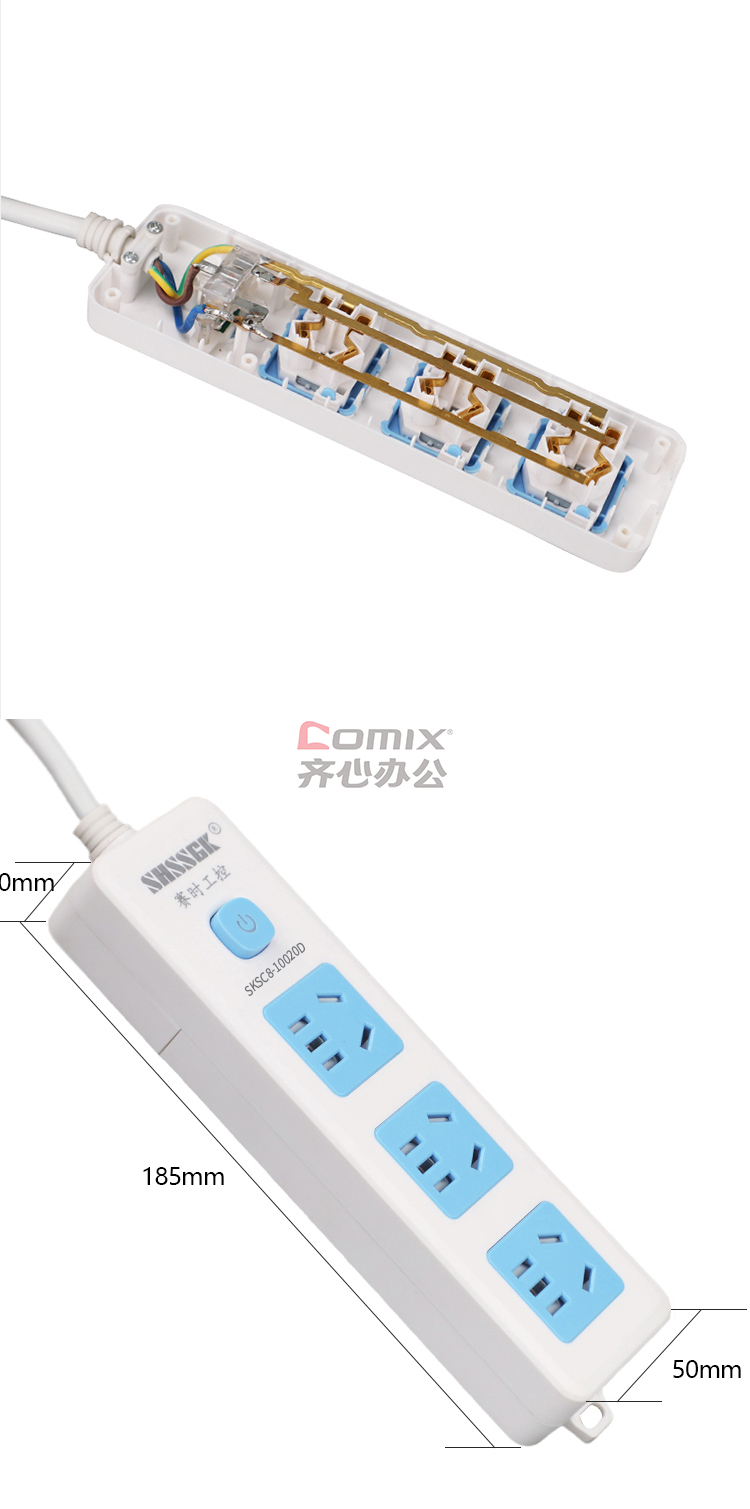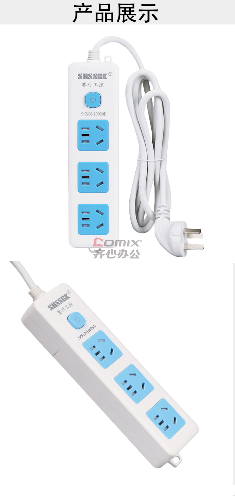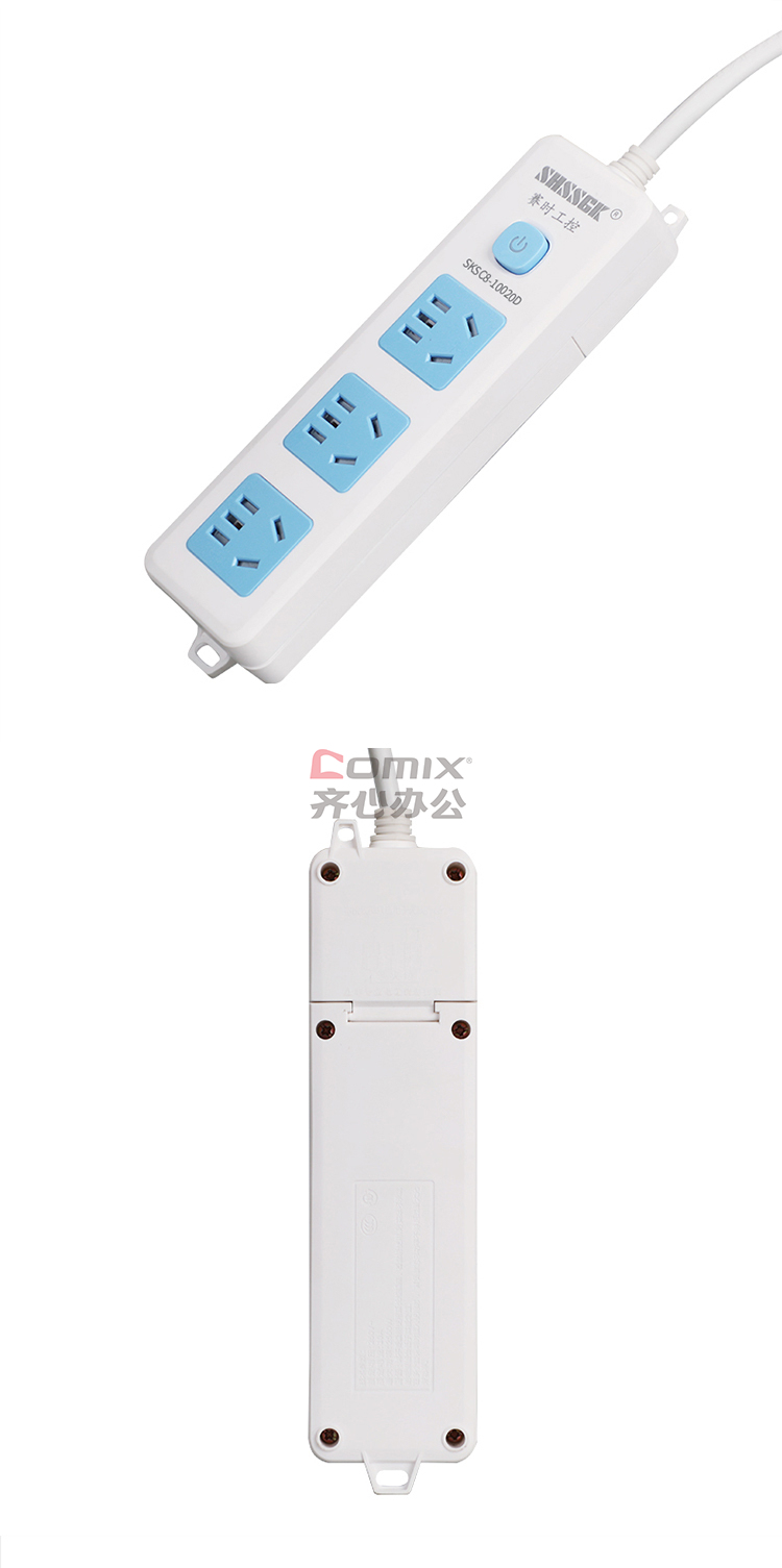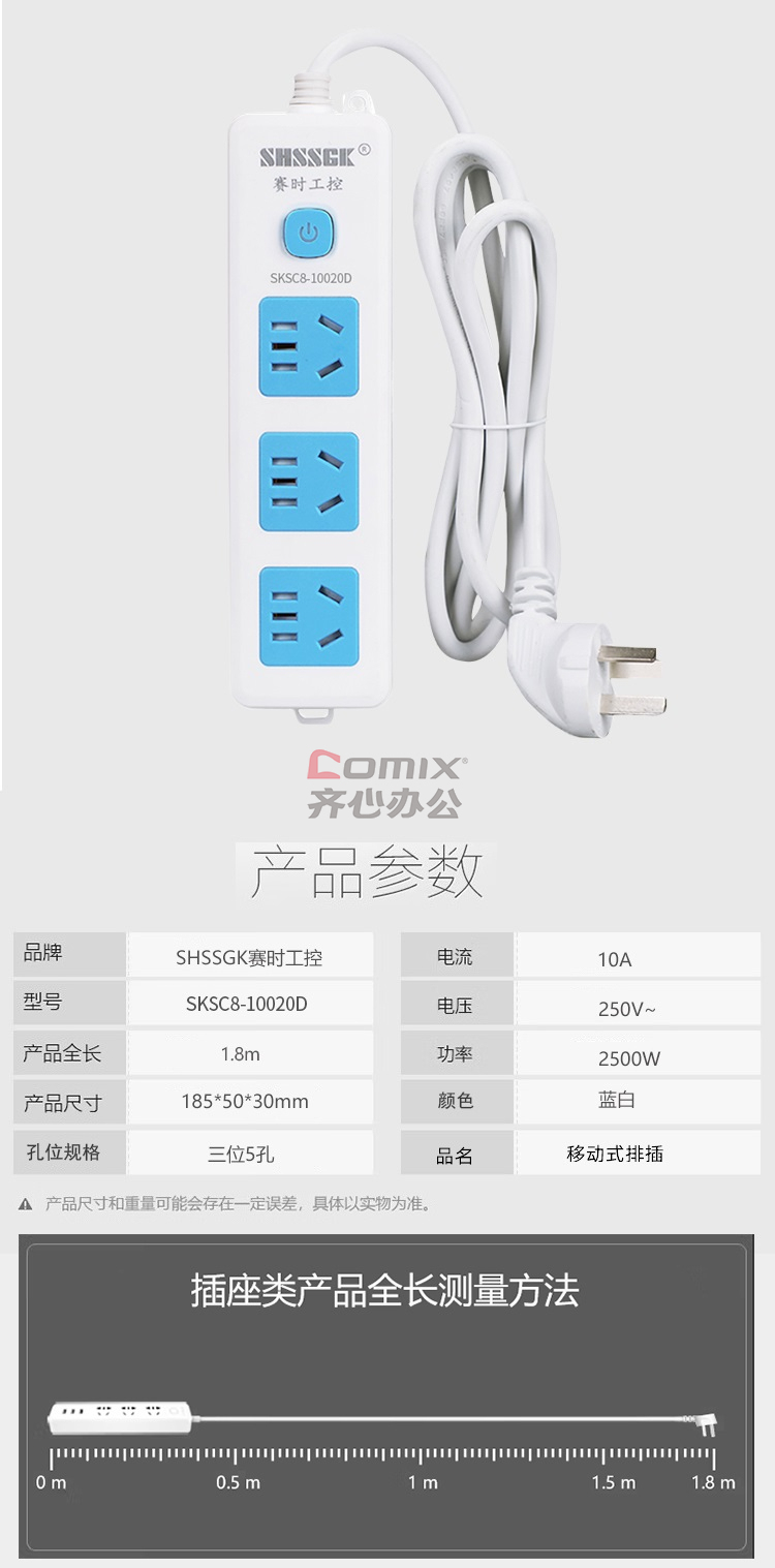 - 商品名称:赛时工控(SHSSGK) SKSC8-10020D 三位5孔 10A 250V 2500W 185*50*30mm 移动式排插 (计价单位:个) 蓝白