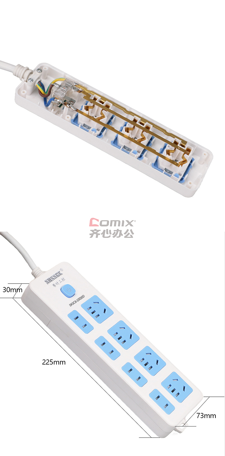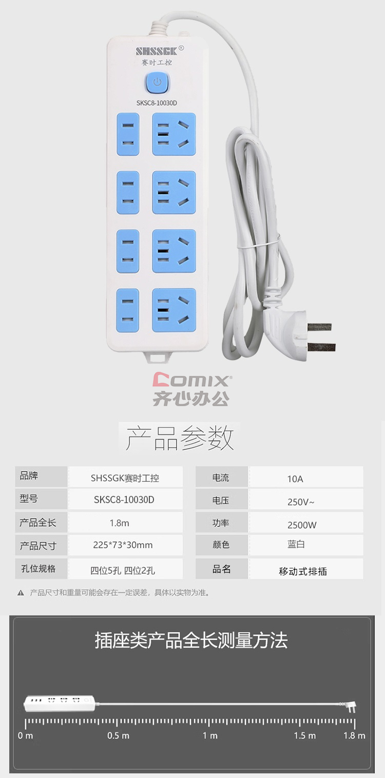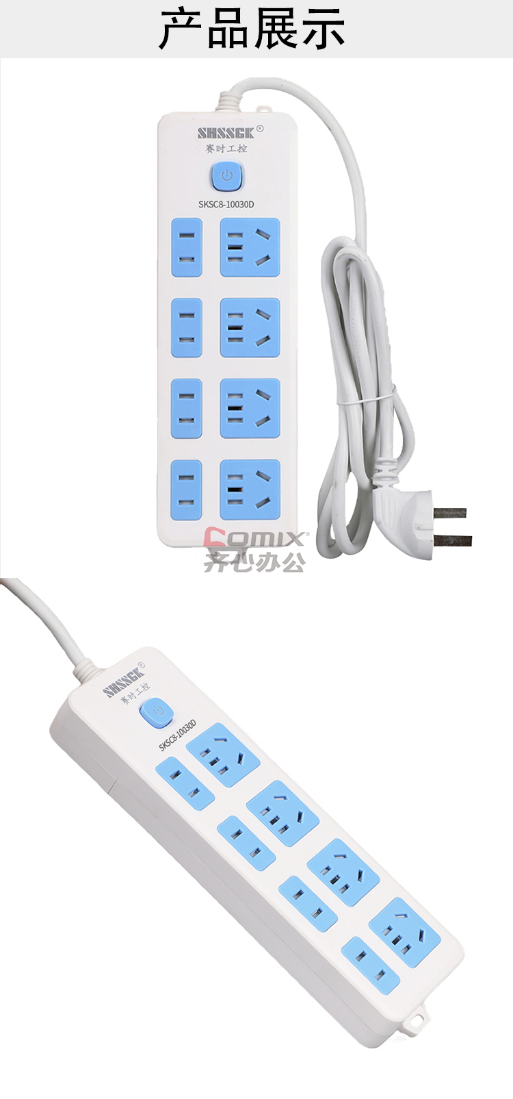 - 商品名称:赛时工控(SHSSGK) SKSC8-10030D 四位5孔 四位2孔 10A 250V 2500W 225*73*30mm 移动式排插 (计价单位:个) 蓝白