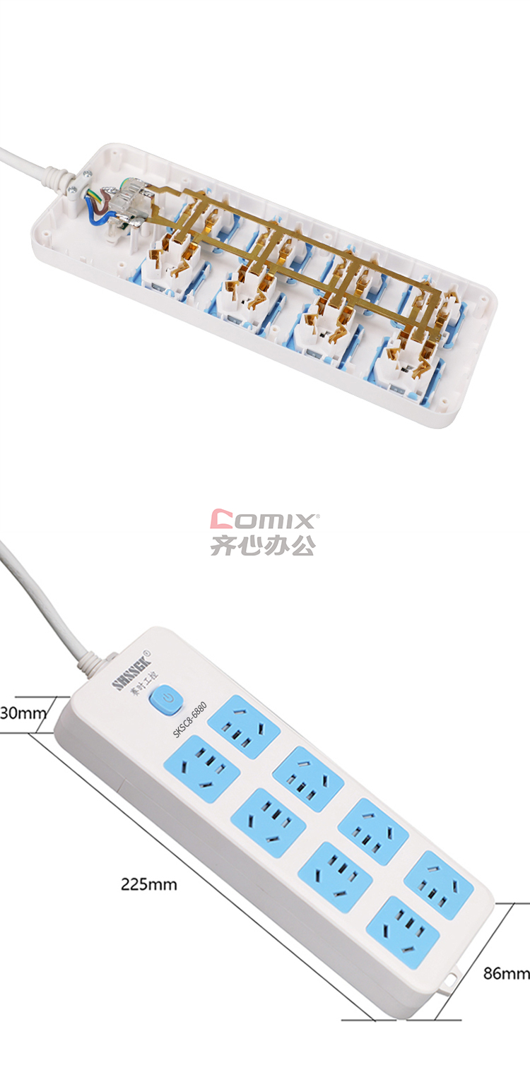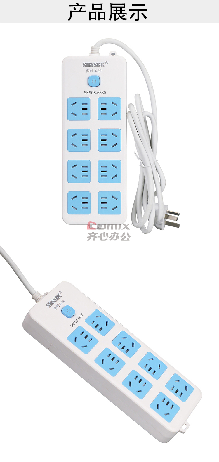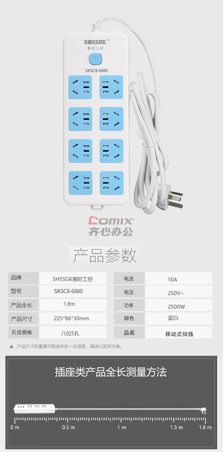 - 商品名称:赛时工控(SHSSGK) SKSC8-6880 八位5孔 10A 250V 2500W 225*86*30mm 移动式排插 (计价单位:个) 蓝白
