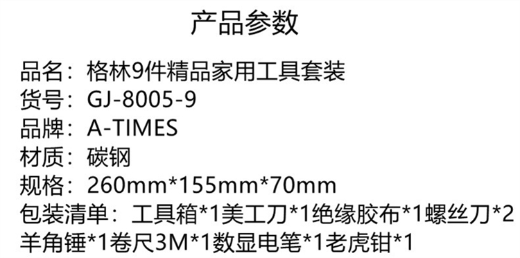 A-TIMES GJ-8005-9 格林9件精品家用工具套装 材质:碳钢规格:260mm*155mm*70mm (单位:套)