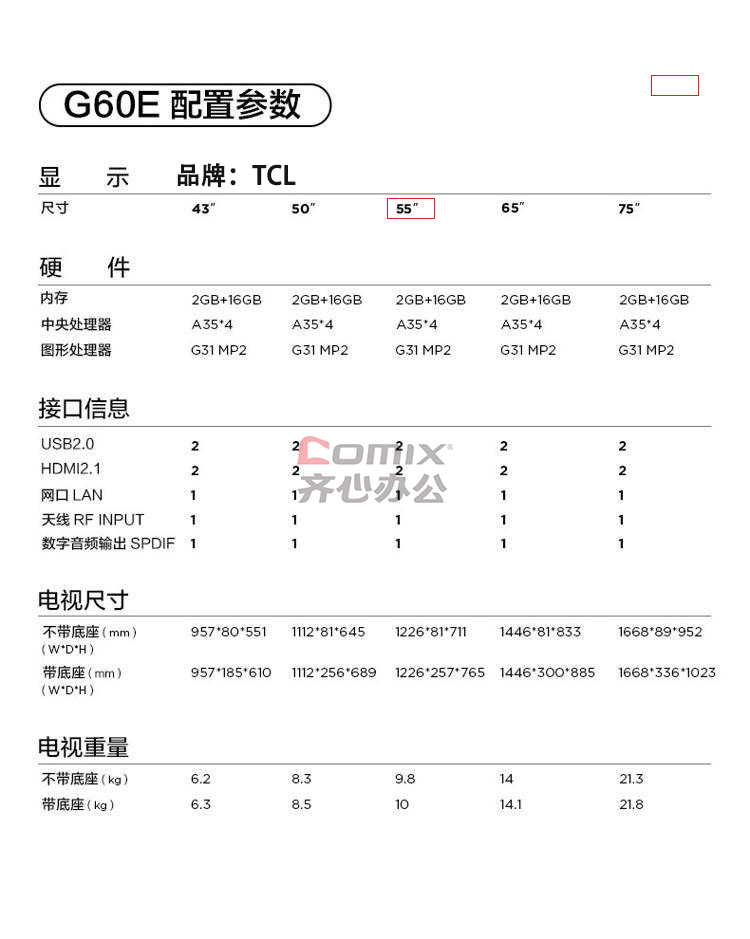 商品名称:TCL 55G60E 55英寸电视机 单位:台