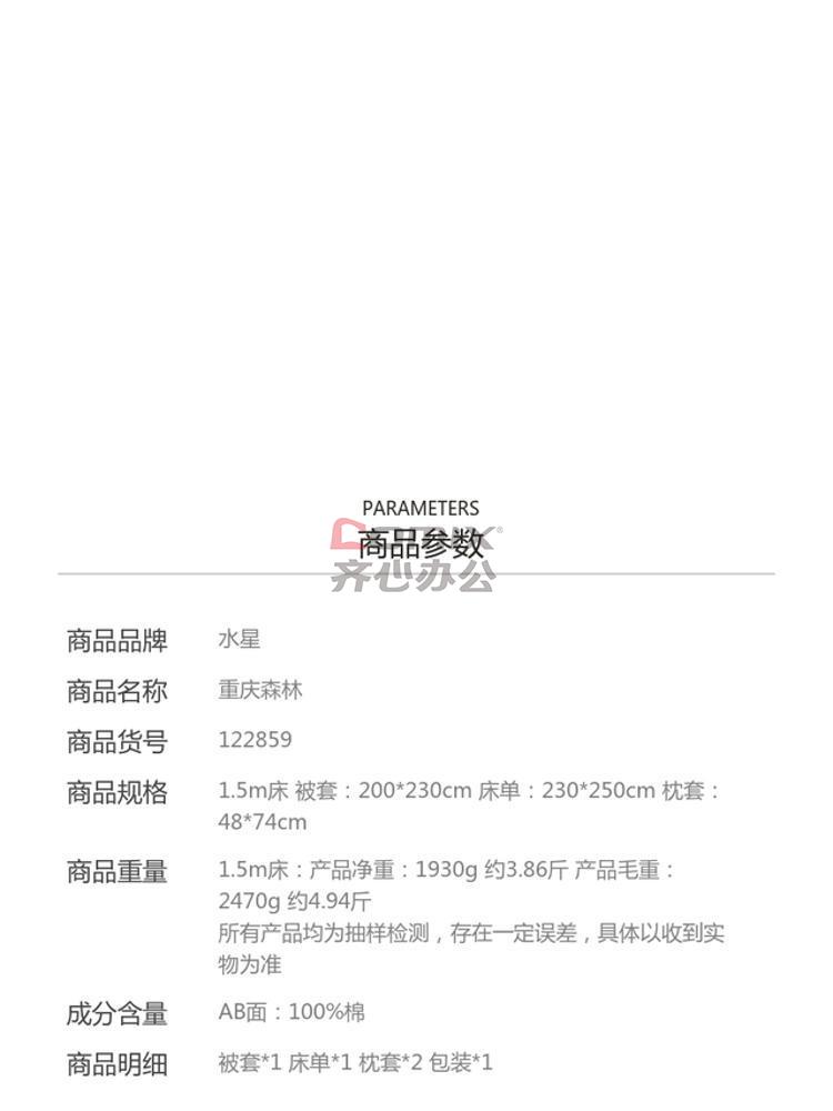 水星家纺 全棉印花四件套——重庆森林122859 床上四件套规格:1.5m床: 被套:200*230cm床单:230*250cm枕套:48*74cm*2 100%棉 (计价单位:套)