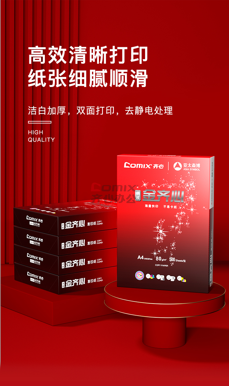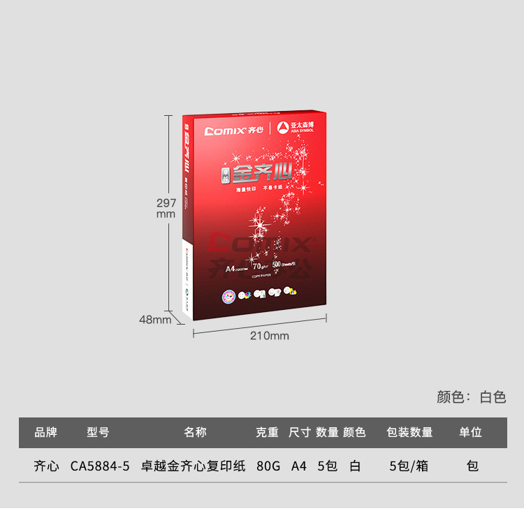 商品名称:齐心 CA5884-5 卓越金齐心复印纸 A4 80克 白色 500张/包 单位:包