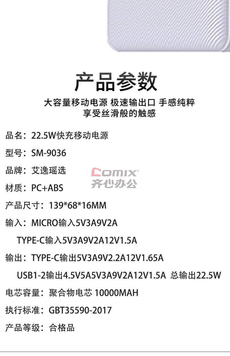 商品名称:艾逸瑶选 SM-9036 22.5W快充移动电源 10000mAh (单位:个)
