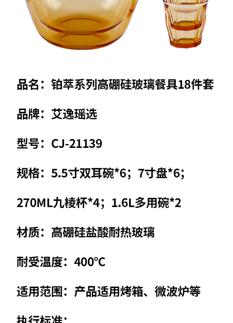 商品名称:艾逸瑶选 CJ-21139 铂萃系列高硼硅玻璃餐具18件套 (单位:套)