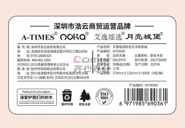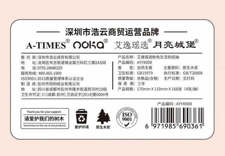 商品名称:艾逸瑶选 AYYX008-4 抽纸 170mmX110mm(四层) 单位:提