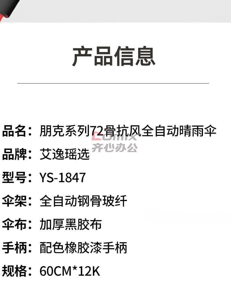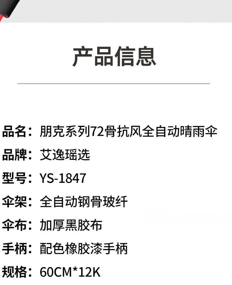 商品名称:艾逸瑶选 YS-1847 朋克系列72骨抗风全自动晴雨伞 60cm*12K(单位:把)