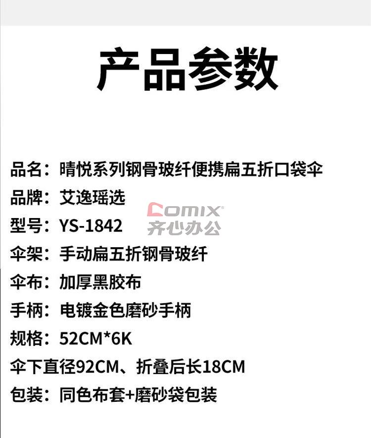 商品名称:艾逸瑶选 YS-1842晴悦系列钢骨玻纤便携扁五折口袋伞 52cm*6K(单位:把)