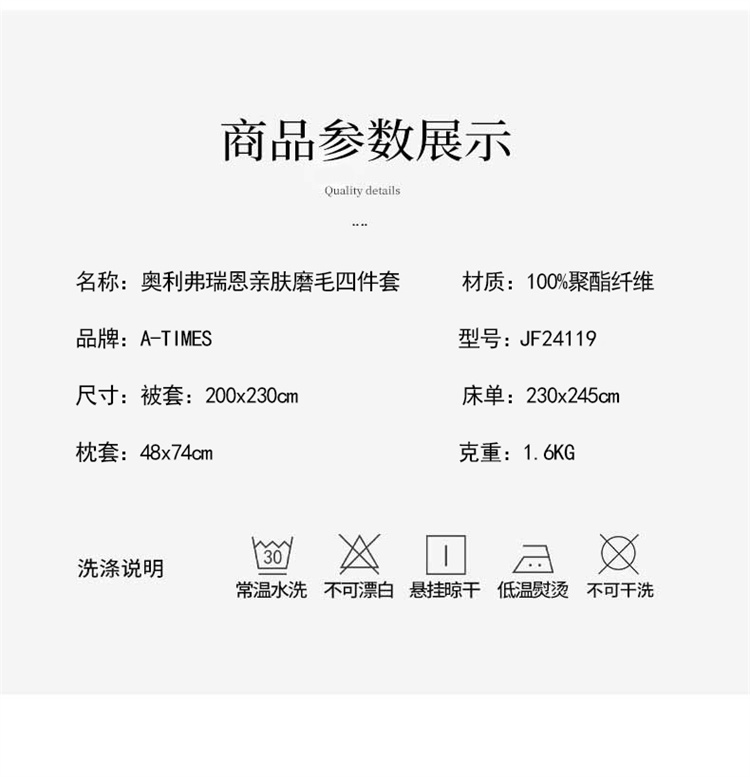 - 商品名称:A-TIMES JF-24119奥利弗瑞恩亲肤磨毛四件套被套:200x230cm床单:230x245cm枕套:48x74cm(单位:套)