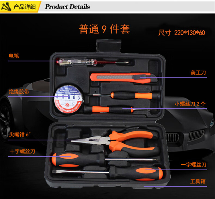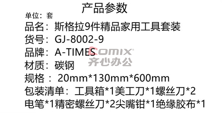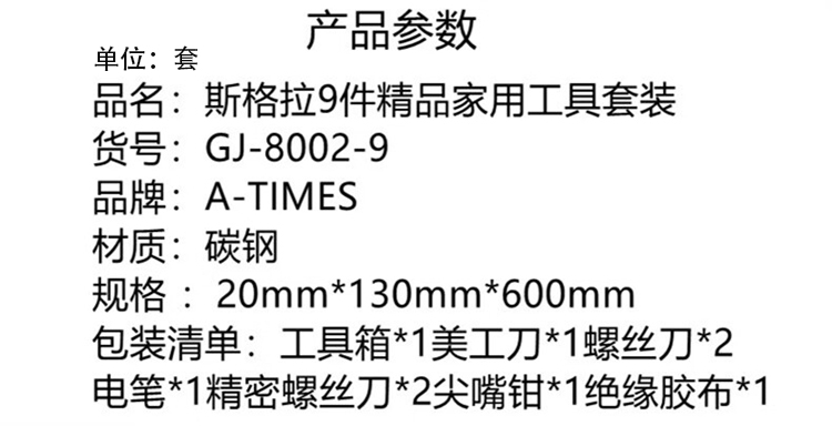 商品名称:A-TIMES GJ-8002-9 斯格拉9件精品家用工具套装 (单位:套)