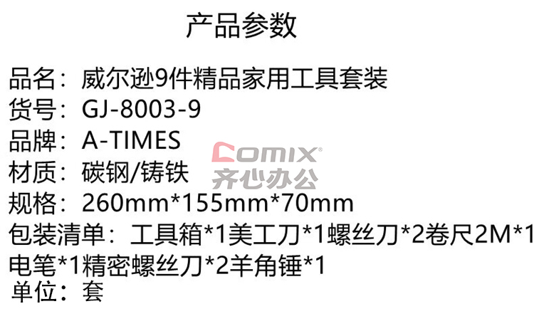 商品名称:A-TIMES GJ-8003-9 威尔逊9件精品家用工具套装 (单位:套)