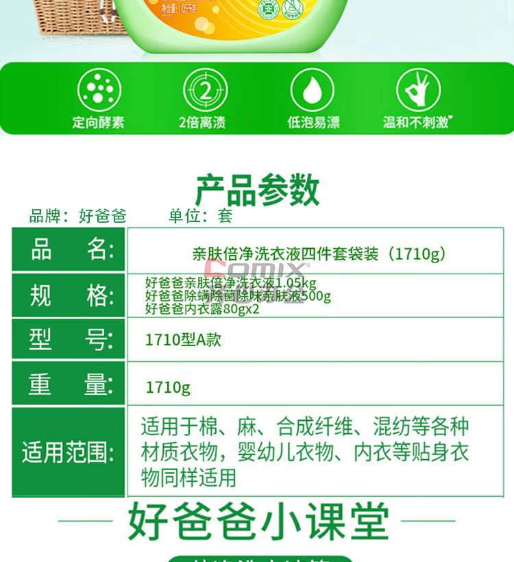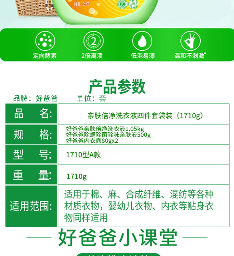 商品名称:好爸爸 1710型A款 亲肤倍净洗衣液四件套袋装(1710g) (单位:套)