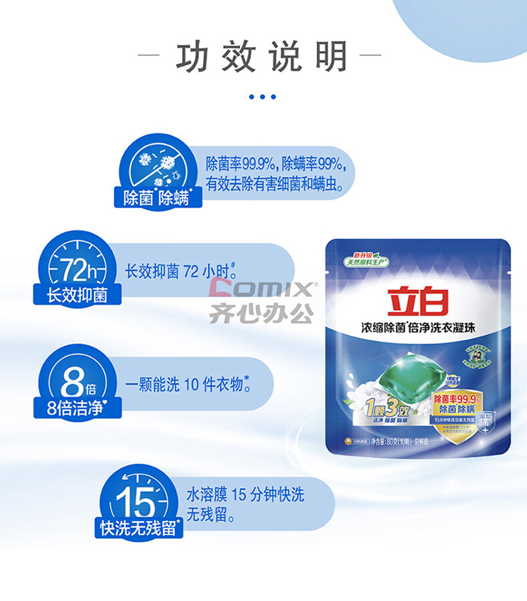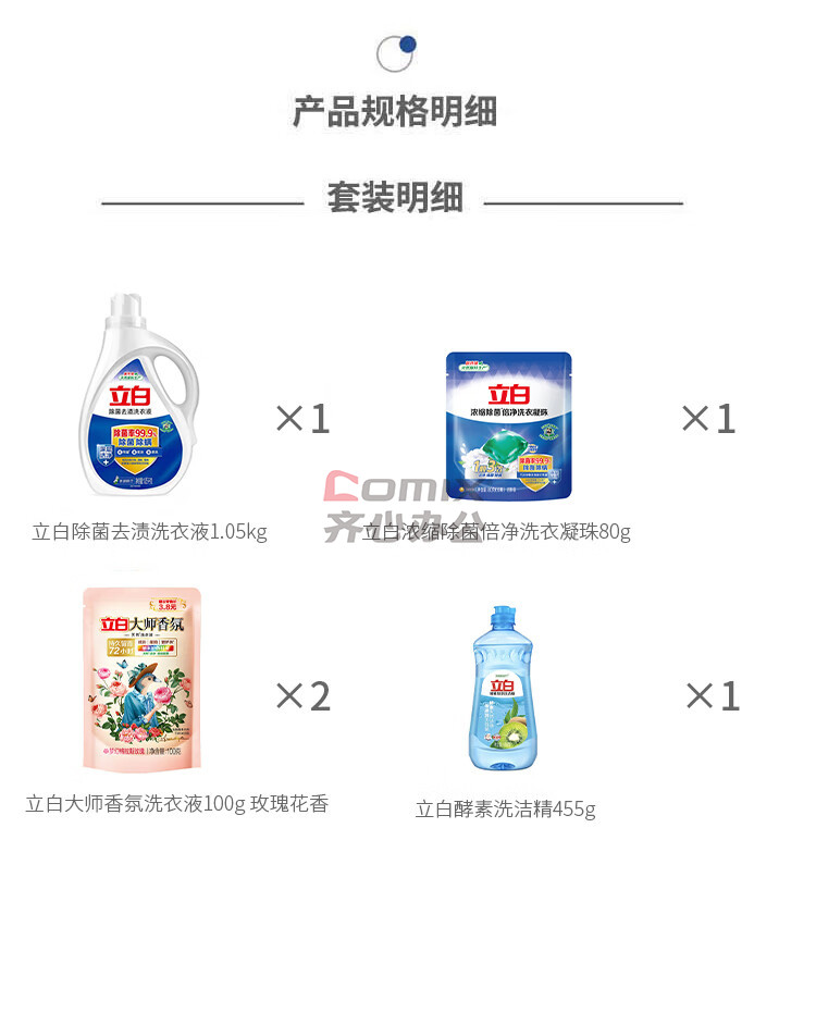 | 商品型号 | 产品规格:1785g 产品配置:立白除菌去渍洗衣液 1.05kg 立白酵素洗洁精 455g 立白浓缩除菌倍净洗衣凝珠 80g 立白大师香氛洗衣液 100g*2袋 |