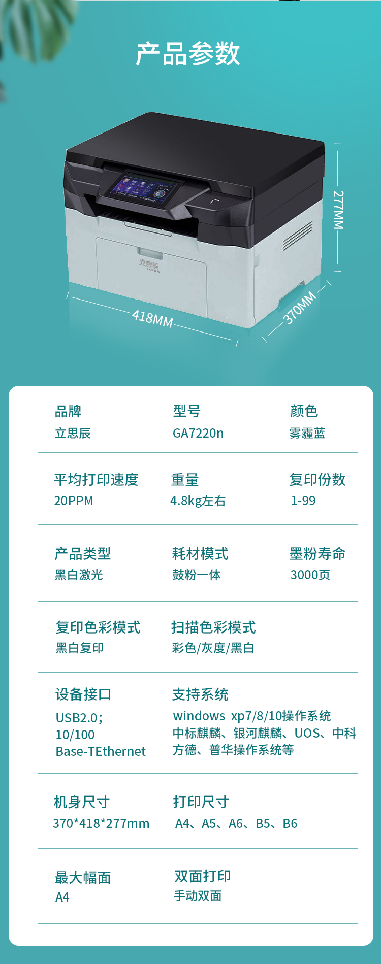 - 商品名称:立思辰(LANXUM) GA7220n 自动双面打印 A4黑白多功能一体机 (计价单位:台) 白色