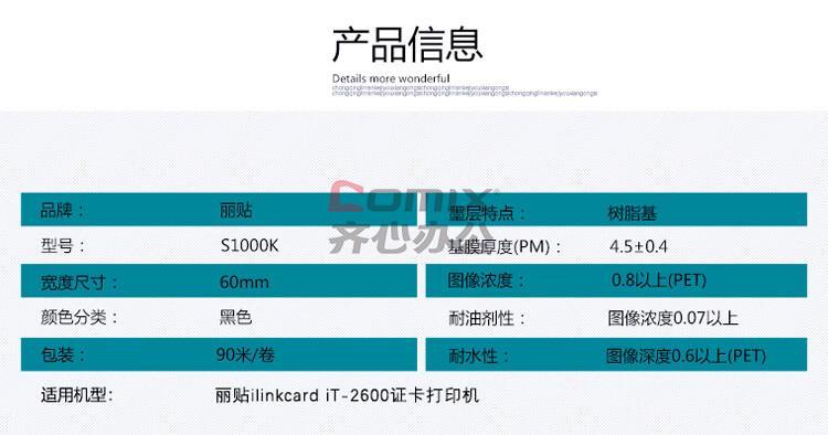 - 商品名称:丽贴 S1000K 60mm*90mm 彩色卡挂牌打印机色带 1.00 个/盒 (计价单位:盒) 黑色