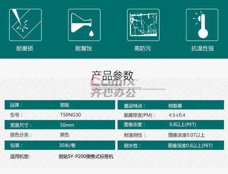 - 商品名称:丽贴 T50NG30 50mm*30mm 热转印打印机色带 1.00 个/盒 (计价单位:盒) 黑色