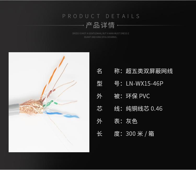 - 商品名称:丽贴 LN-WX15-46P 0.46mm纯铜线芯 超五类双屏蔽网线 300.00 米/箱 (计价单位:箱) 灰色