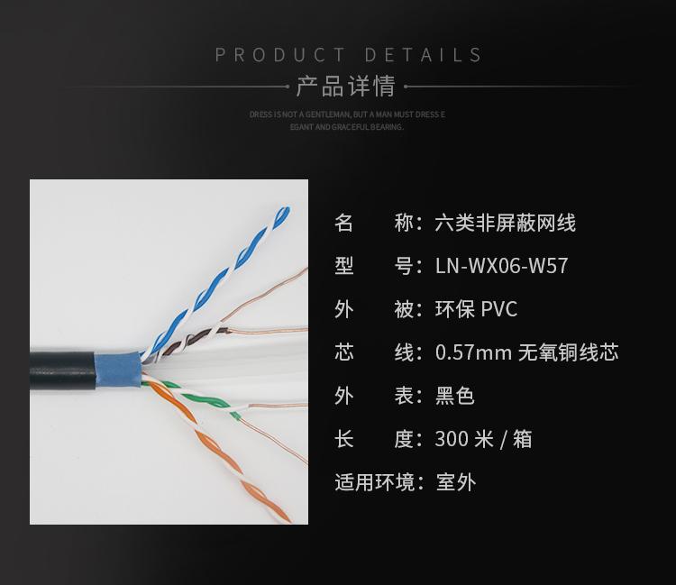 - 商品名称:丽贴 LN-WX06-W57 0.57mm无氧铜线芯 室外六类非屏蔽网线 300.00 米/箱 (计价单位:箱) 黑色
