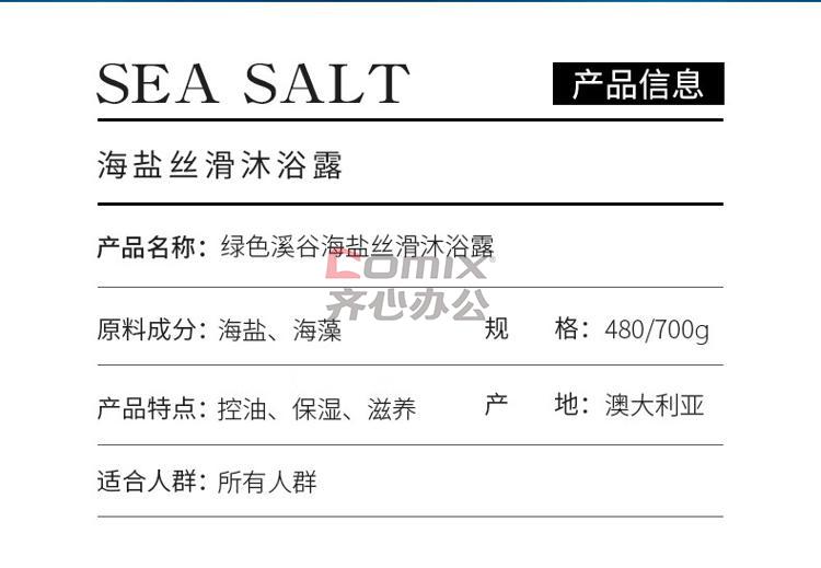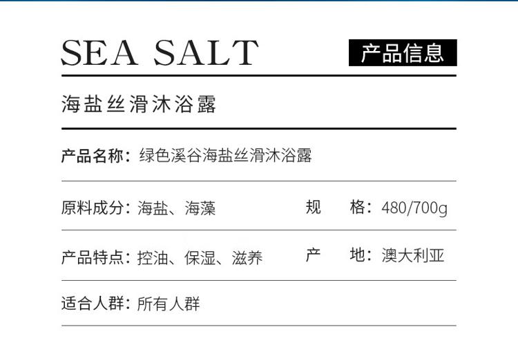 商品名称:绿色溪谷 海盐丝滑沐浴露 480g 单位:瓶