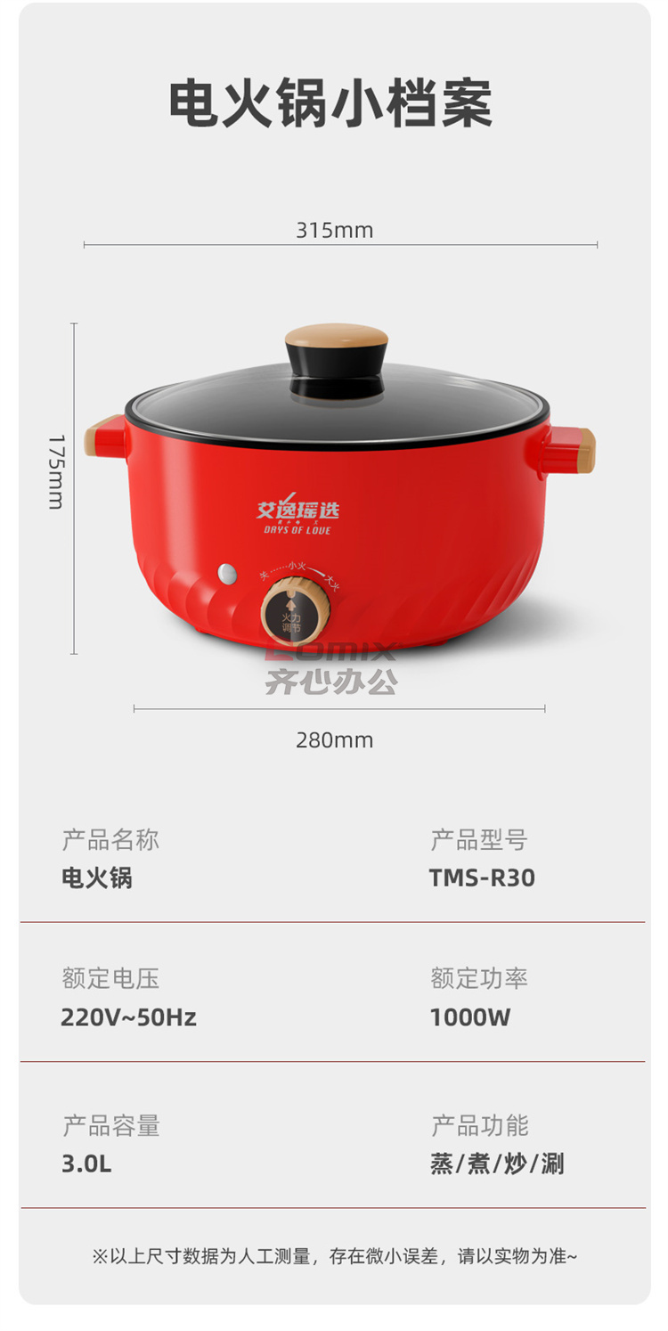 商品名称:艾逸瑶选 TMS-R30B 电煮锅 3L 红色 单位:个