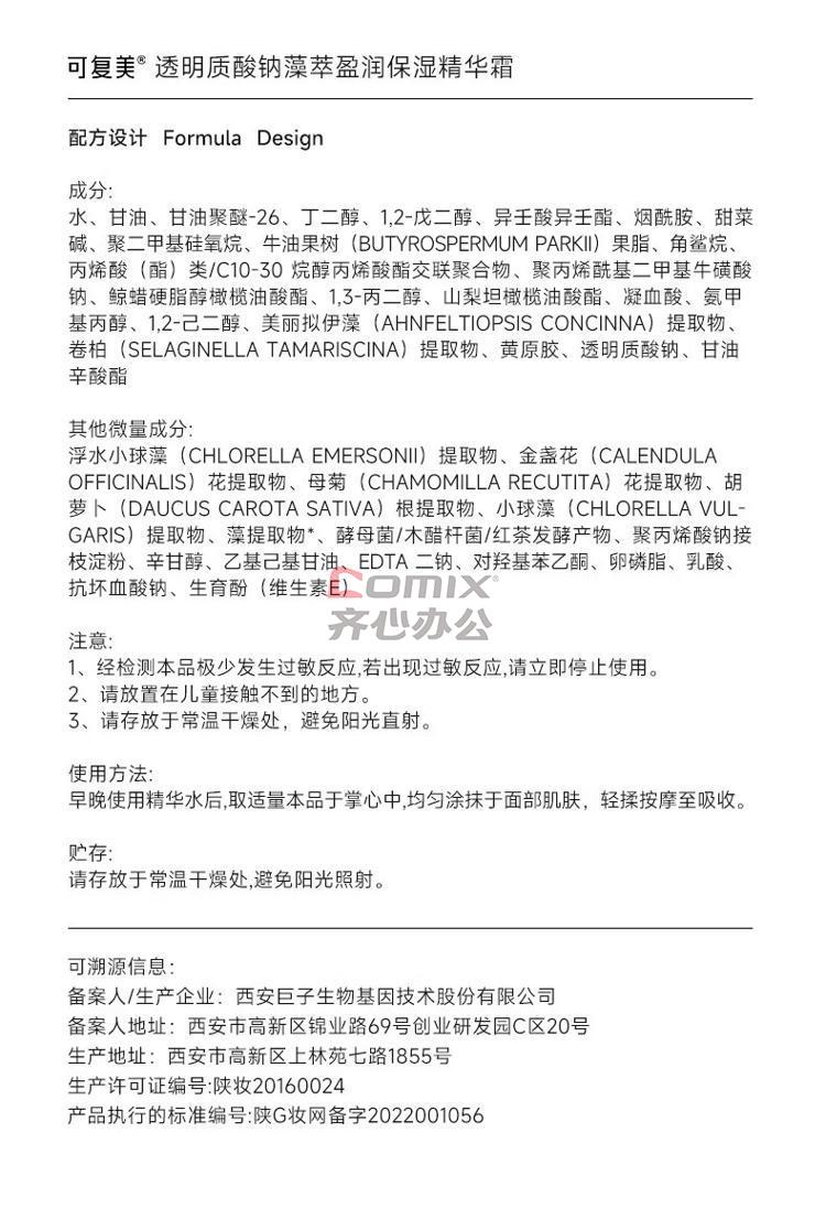 商品名称:可复美透明质酸钠藻萃盈润保湿精华霜50g/瓶/盒 单位:瓶