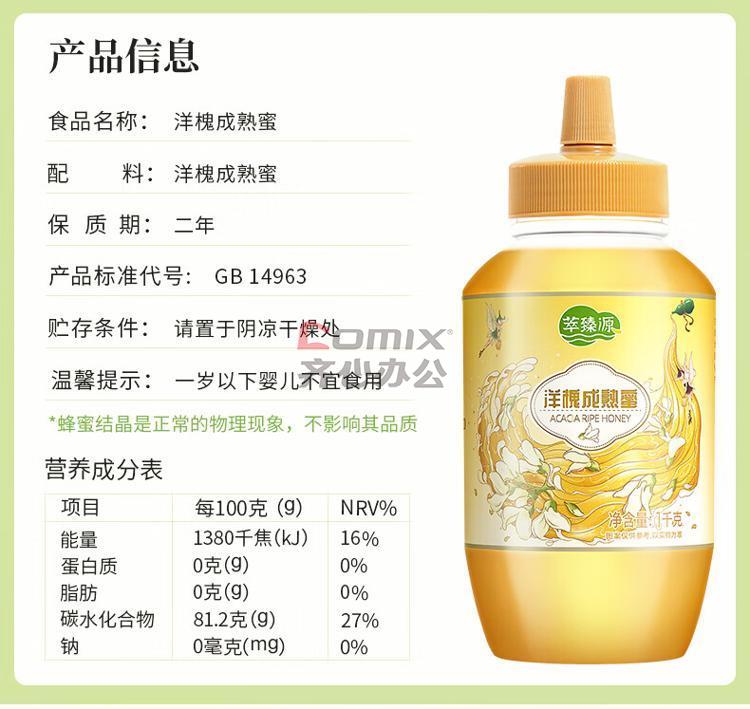 商品名称:萃臻源 蜂蜜 洋槐蜜 1000g(瓶装) 成熟蜜 单位:瓶