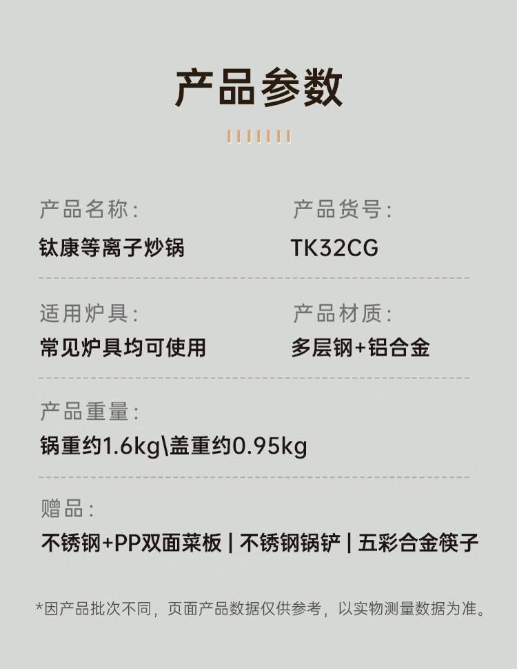 商品名称:炊大皇 钛康等离子不粘炒锅 32cm TK32CG 单位:个