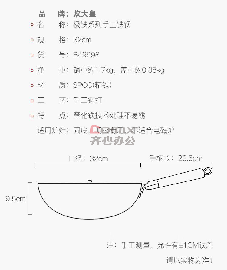 商品名称:炊大皇 32cm 纯手工铁打铁锅 B49698 单位:个