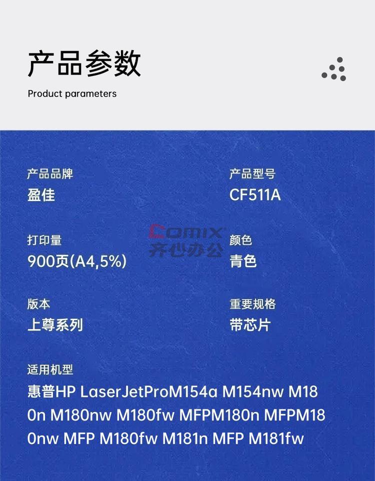 - 商品名称:盈佳 CF511A 硒鼓 上尊系列 带芯片 青色 900页(A4,5%)适用于惠普HP LaserJetProM154a M154nw M180n M180nw M180fw MFPM180n(单位:个)