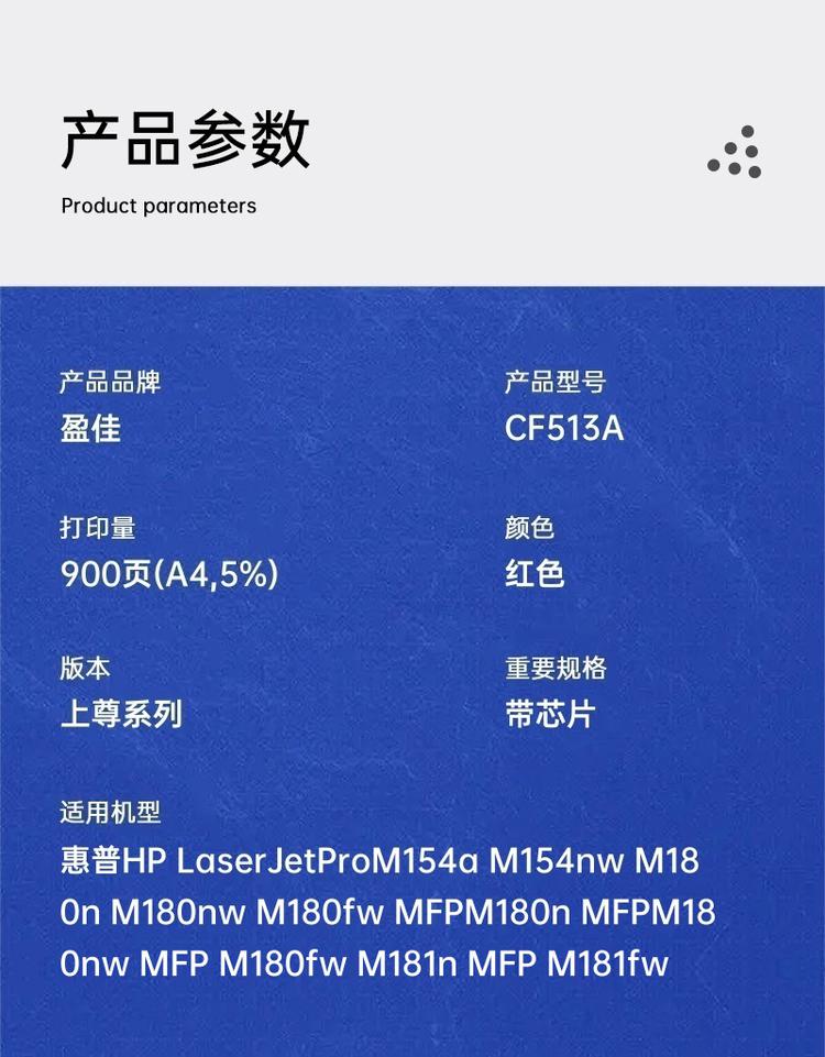 - 商品名称:盈佳 CF513A 硒鼓 上尊系列 带芯片 红色 900页(A4,5%)适用于惠普HP LaserJetProM154a M154nw M180n M180nw M180fw MFPM180n(单位:个)