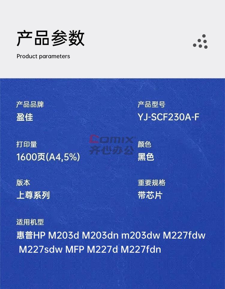 - 商品名称:盈佳 YJ-SCF230A-F 粉盒 上尊系列 带芯片 黑色 1600页(A4,5%)适用于惠普HP M203d M203dn m203dw M227fdw M227sdn MFP M227d M227fdn(单位:个)