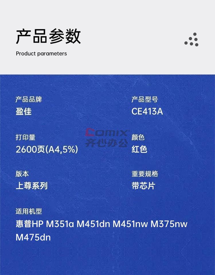 - 商品名称:盈佳 CE413A 硒鼓 上尊系列 带芯片 红色 2600页(A4,5%)适用于惠普HP M351a M451dn M451nw M375nw M475dn(单位:个)