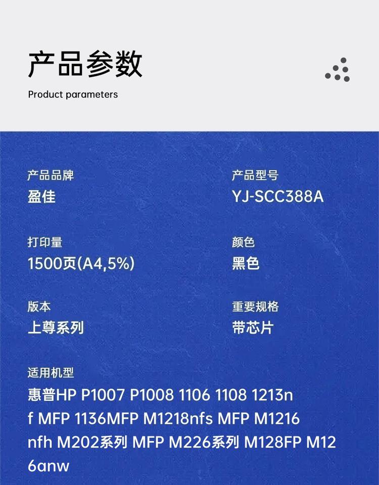 - 商品名称:盈佳 YJ-SCC388A 硒鼓 上尊系列 带芯片 黑色 1500页(A4,5%)适用于惠普HP P1007 P1008 1106 1108 1213nf MFP 1136MFP M1218nfs MFP M1216nfh(单位:个)
