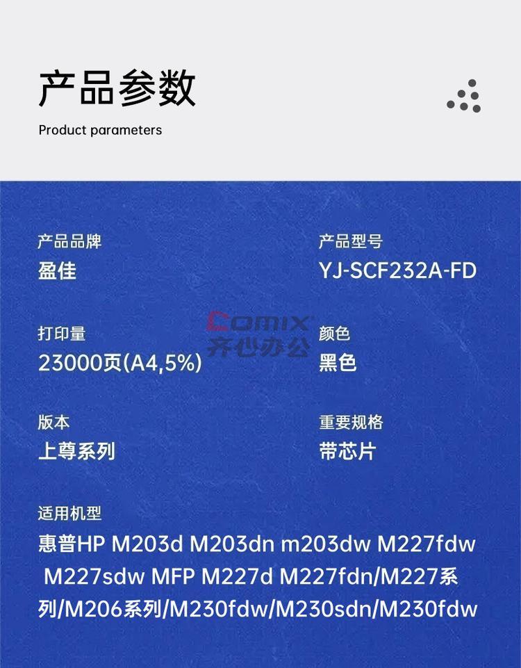 - 商品名称:盈佳 YJ-SCF232A-FD 硒鼓 上尊系列 带芯片 黑色 23000页(A4,5%)适用于惠普HP M203d M203dn m203dw M227fdw M227sdw MFP M227d M227fdn(单位:个)