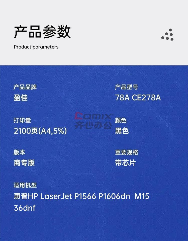 - 商品名称:盈佳 78A CE278A 硒鼓 商专版 带芯片 黑色 2100页(A4,5%)适用于惠普HP LaserJet P1566 P1606dn M1536dnf(单位:个)