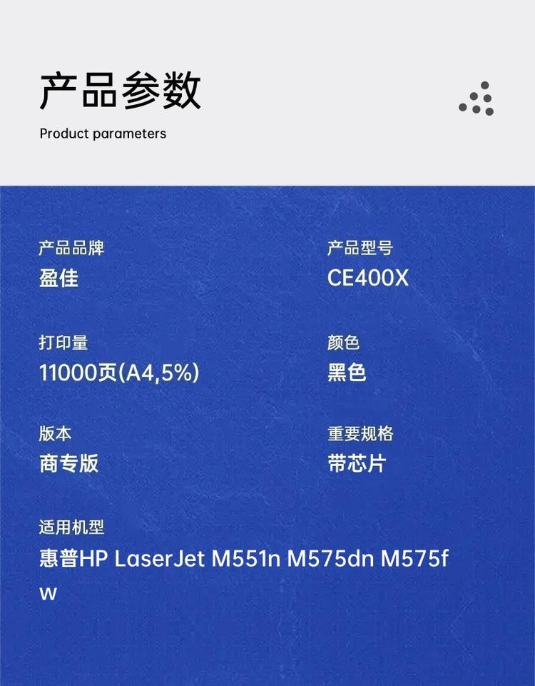 - 商品名称:盈佳 CE400X 硒鼓 商专版 带芯片 黑色 11000页(A4,5%)适用于惠普HP LaserJet M551n M575dn M575fw(单位:个)