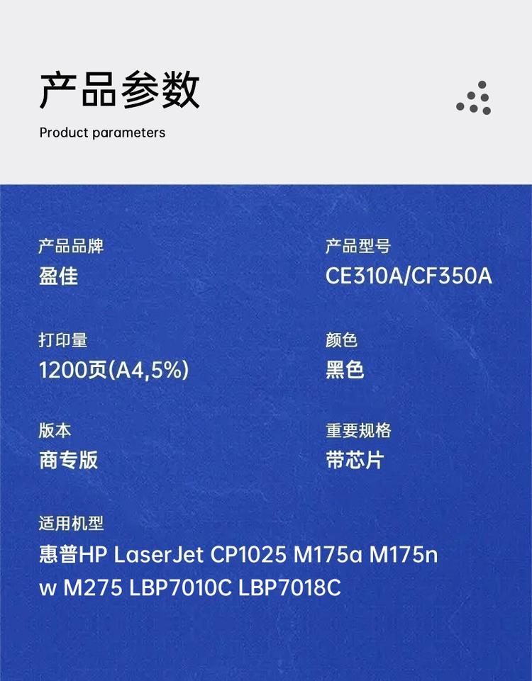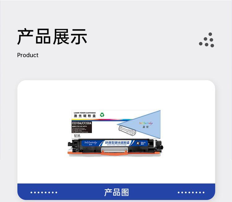 - 商品名称:盈佳 CE310A/CF350A 粉盒 商专版 带芯片 黑色 1200页(A4,5%)适用于惠普HP LaserJet CP1025 M175a M175nw M275 LBP7010C(单位:个)