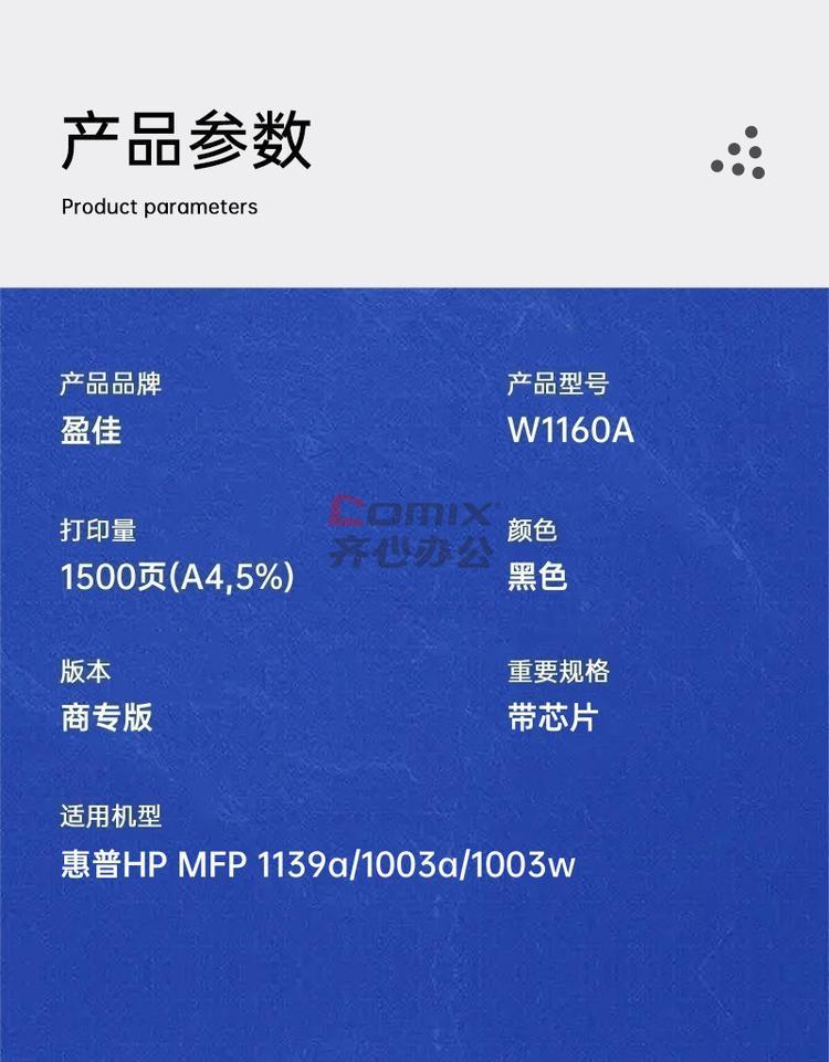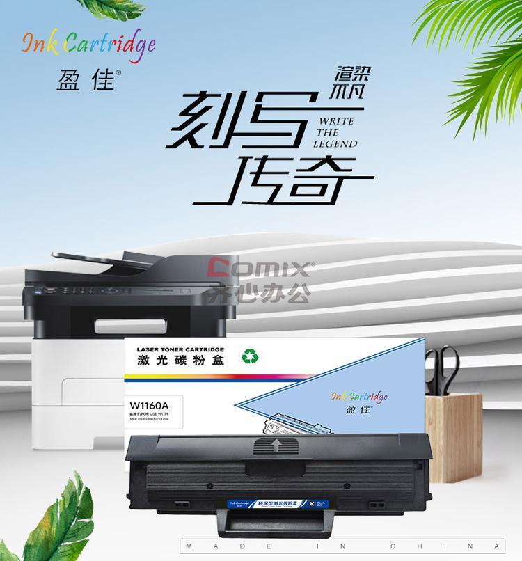 - 商品名称:盈佳 W1160A 硒鼓 商专版 带芯片 黑色 1500页(A4,5%)适用于惠普HP MFP 1139a/1003a/1003w(单位:个)