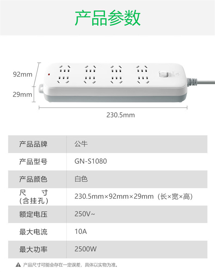 商品名称:公牛 GN-S1080 插座 8位总控3米 单位:个