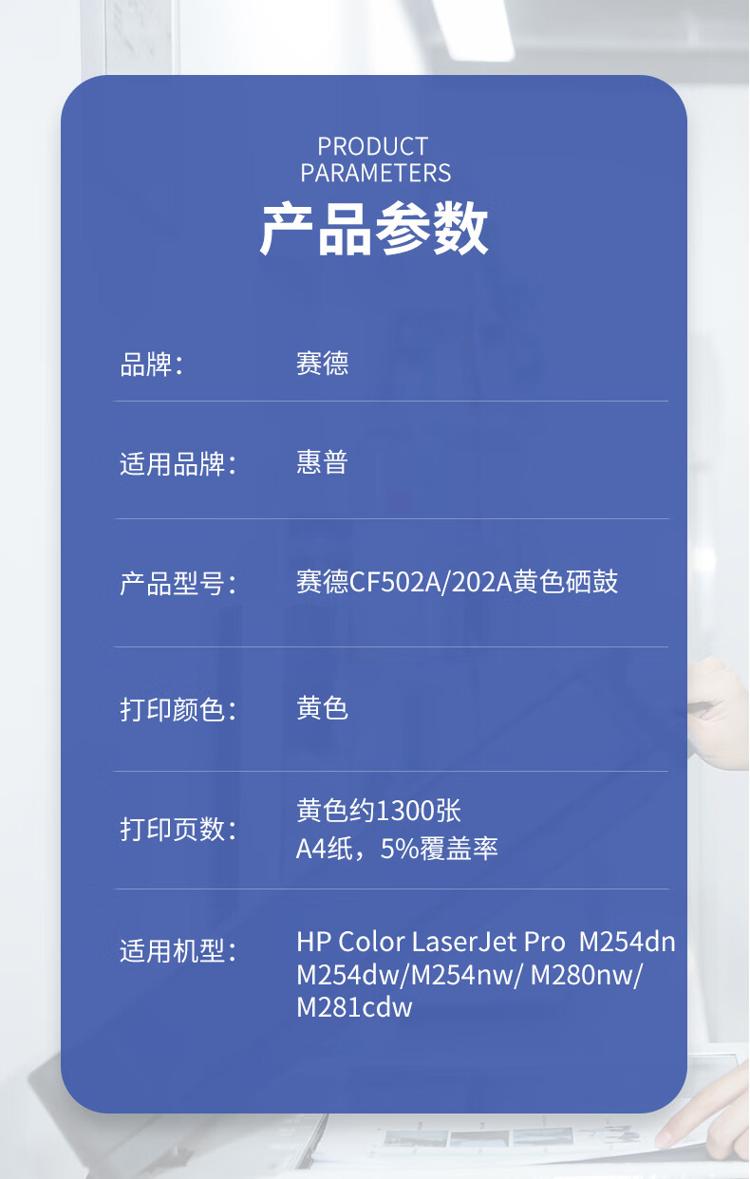 - 商品名称:赛德 CF502A 打印量1300页 适用惠普M254dn/M254dw/M254nw/M280nw/M281fdn/fdw 硒鼓 (计价单位:只) 黄色