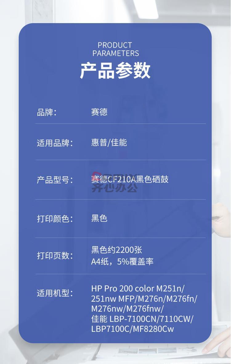 - 商品名称:赛德 CF210A 打印量2200页 适用惠普M251n/251nw/M276n/M276nw 硒鼓 (计价单位:只) 黑色