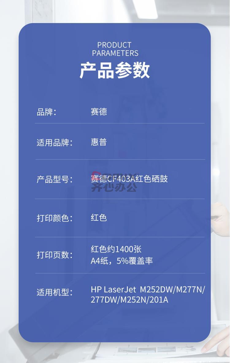 - 商品名称:赛德 CF403A 打印量1400页 适用惠普M252DW/M277N/277DW/M252N/201A 硒鼓 (计价单位:只) 红色