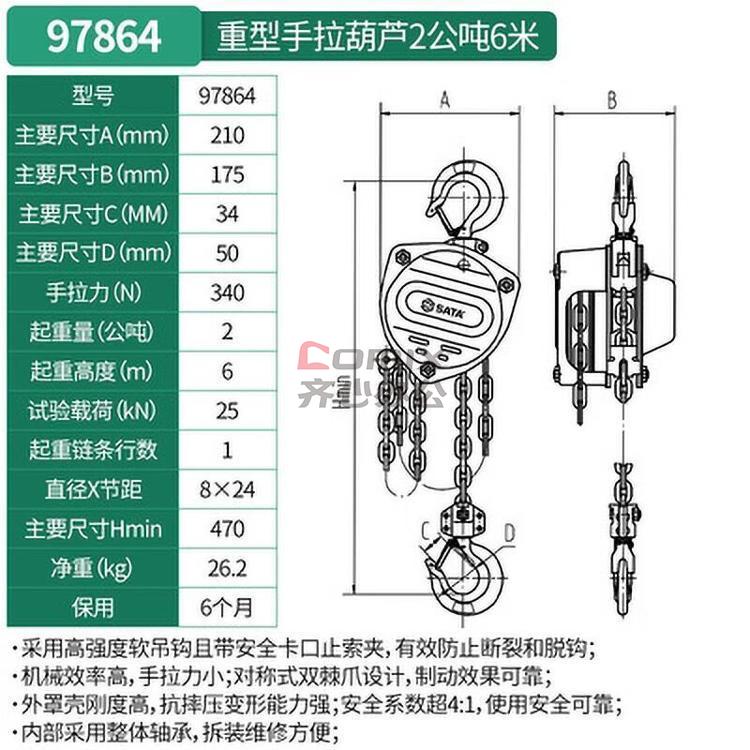 商品名称:世达/SATA 重型手拉葫芦 97864 额定载重:2000kg 起升高度:6m