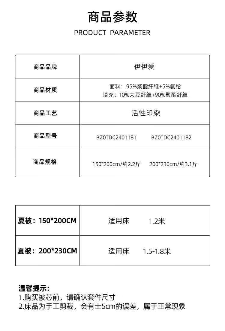 - 商品名称:伊伊爱 BZ0TDC2401181 针织棉凉感 氨纶印华大豆夏被 150*200cm 2.2斤(单位:条)