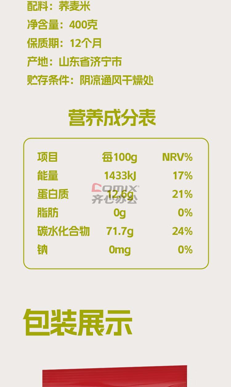 商品名称:可益康 荞麦米 400g 单位:袋